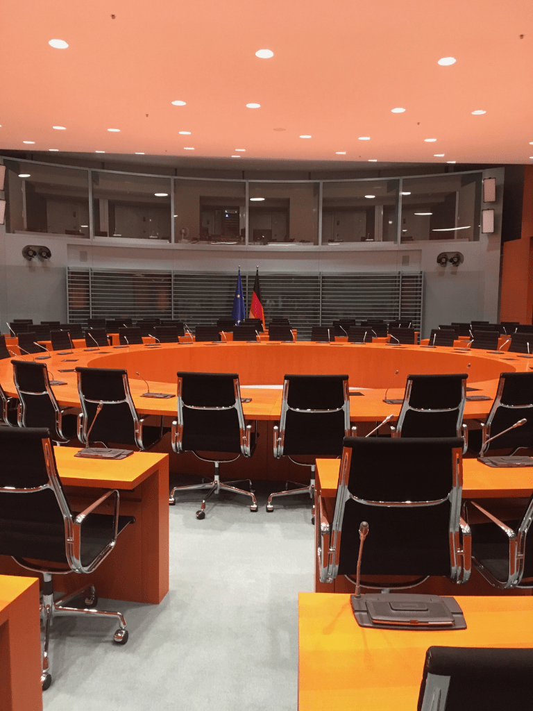 The German Chancellory is the executive office where most diplomats discuss the past and present roles regarding the Federal Republic of Germany. Outside of the conference rooms, there are paintings of former Chancellors and leaders of the agency.